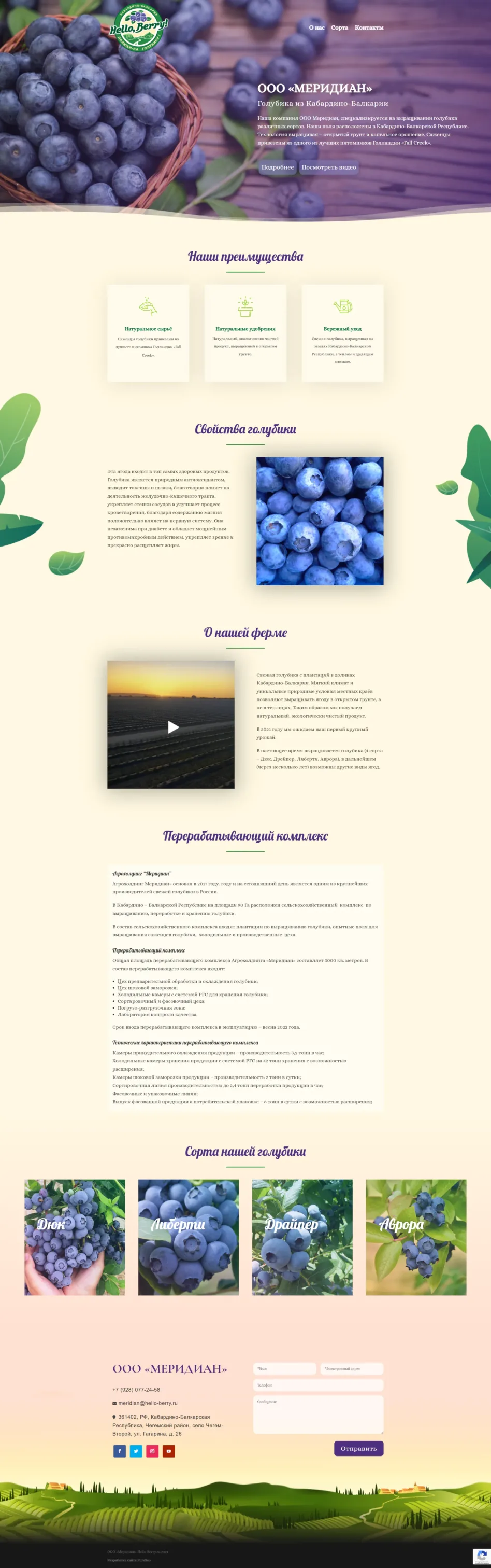ООО Меридиан, специализируется на выращивании голубики различных сортов. Наши поля расположены в Кабардино-Балкарской Республике. Технология выращивая – открытый грунт и капельное орошение. Саженцы привезены из одного из лучших питомников Голландии «Fall Creek».
